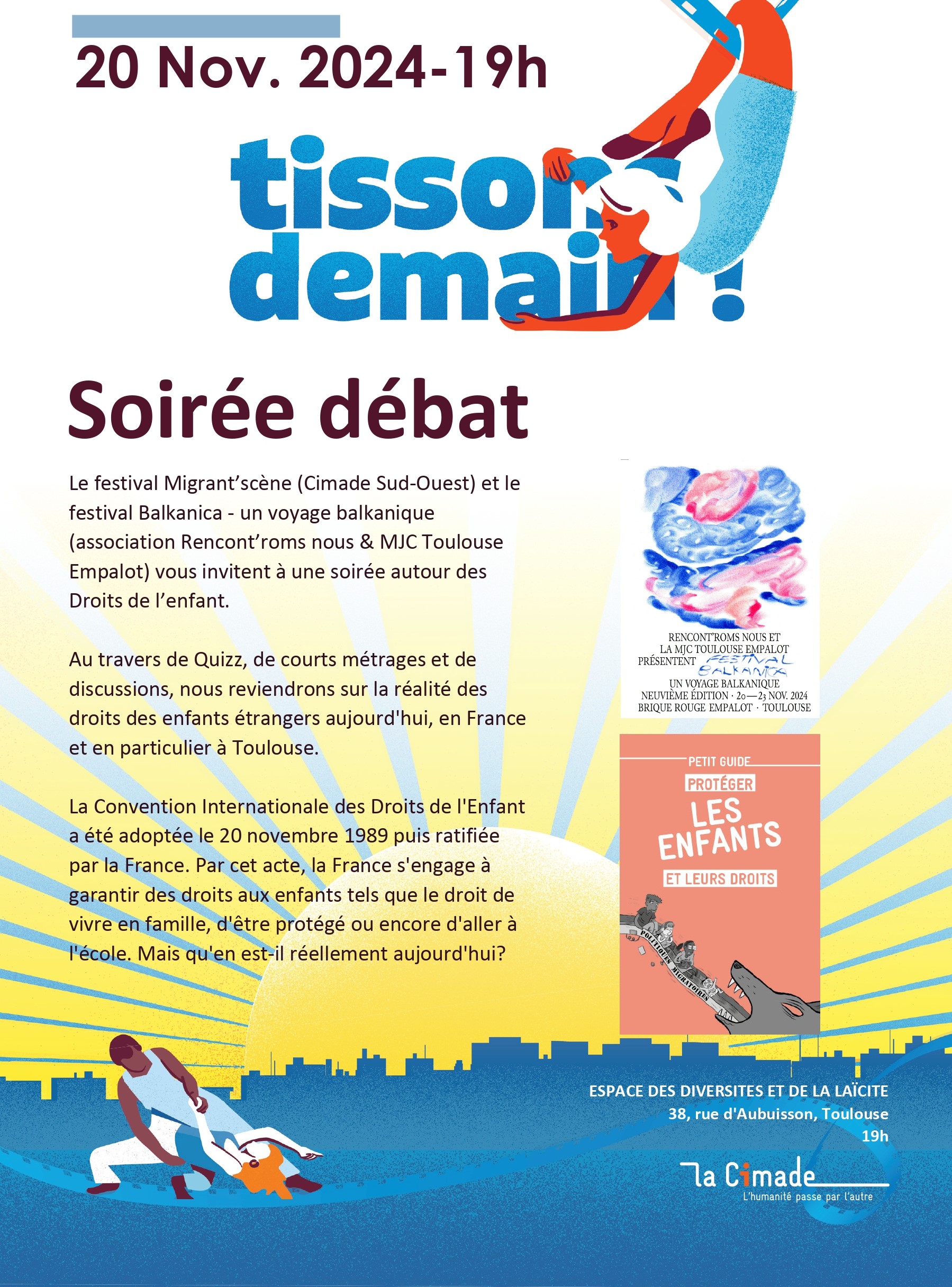 Cette année encore, le festival Balkanica – un voyage balkanique s’associe avec le festival Migrant’scène, organisé par la Cimade Sud-Ouest (dont la thématique 2024 est Tissons demain), pour une soirée commune le mercredi 20 novembre, à l’espace diversités laïcité. Le 20 novembre étant la Journée internationale des Droits de l’Enfant, nous proposons ainsi une soirée rencontre / projection / discussion autour de cette thématique avec courts-métrages, quizz et discussions.