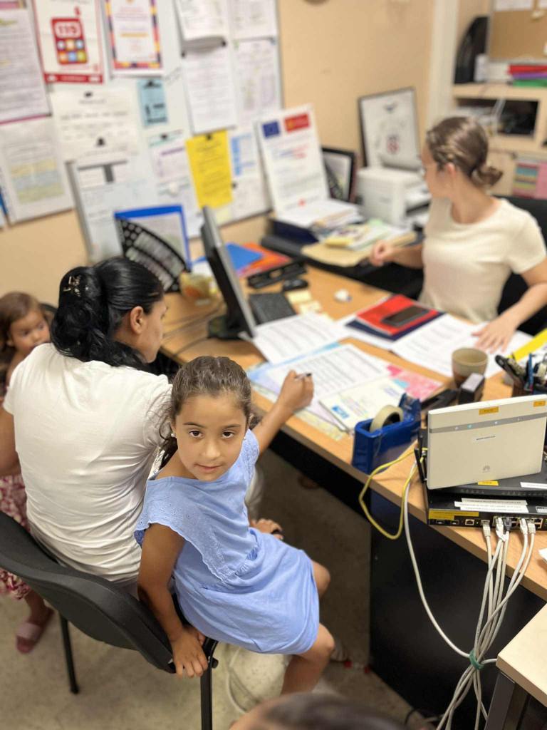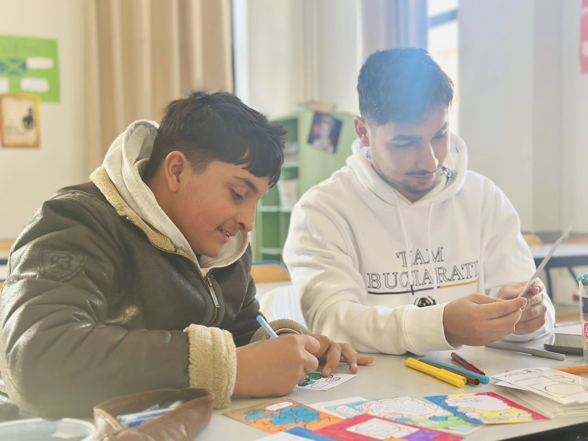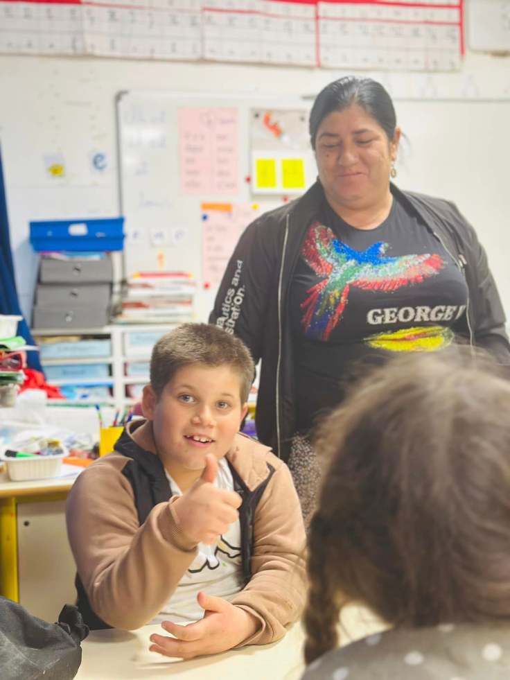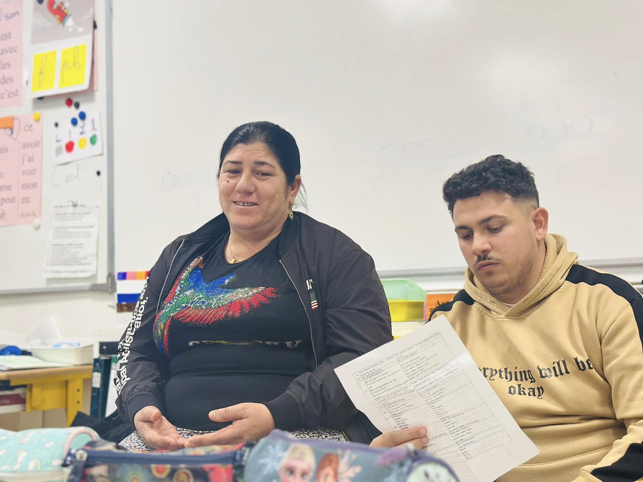 Antonio, puis Florin, étaient présent en début de matinée dans la classe, aux côtés des élèves du terrain nouvellement arrivés à l’école, pour les accompagner, aider, rassurer, être aux côtés des enseignantes.
